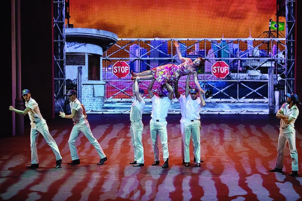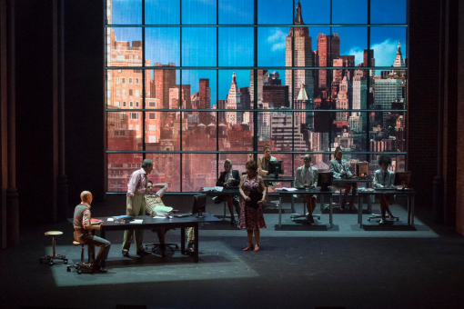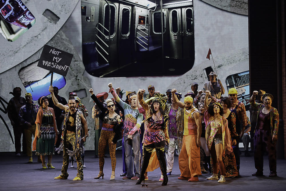 À cet égard, la brillante et intelligente mise en scène d’Olivier Bénézech se garde de ramener l’histoireà l’époquede sa création : c’est bien d’aujourd’hui qu’il s’agit, avec ces clins d’œil entendus, jamais insistants à l’actualité, tel un panneau dans une manif, « Not my president » (réalité politique puisque New York n’est pas une ville « trumpiste »), une vidéo affichant la trogne d’un Trump casquette à l’égoïste slogan démago : « America again ». Loin d’être populiste, le peuple nombreux qui meuble la scène d’entrée, est hétéroclite, hétérogène, hétérodoxe à la doxa bassement racoleuse de ce Président, mêlant, métissant généreusement, à notre regard ébahi, blancs, afro-américains, indiens, latinos, population typiquement locale mais aussi, sous la houlette du petit drapeau d’un guide touristique, une troupe ébaubie, un troupeau ébloui de touristes d’ailleurs dans cette ville monde, foule bigarrée dans une totale liberté vestimentaire, cool ou smart, traversée de culture hippie, pop, hip-hop, d’hier aux tendances rap d’aujourd’hui traduite aussitôt en break dance, joyeuse disparité des shorts, du costume du joueur de football américain, aux look hard ou drags Queens (Frédéric Olivier), exhibant des plastiques body buildées, pour toutes les préférences sexuelles et les goûts : les gays, les putes et tout cet arc-en-ciel libertaire devenu aujourd’hui l’un des emblèmes de cette ville sans préjugés ni tabous.