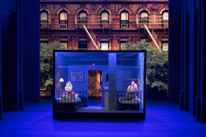 Scène encadrée à cour et jardin et parfois en fond d’immeuble, de la brique rouge séculaire d’une ville qui l’arbore comme une fière marque d’antiquité ; visions de murs tagués, quelque figure à la Basquiat. Une ingénieuse roue tourne tel un kaléidoscope, un diaporama, nous assimilant aux touristes pour embrasser d’un regard émerveillé ces vues partielles et multiples (vidéos de Gilles Papain), ces quartiers, littéralement, de la Grosse Pomme, Greenwich Village, Chelsea, pont de Brooklyn, dans des lumières de Marc-Antoine Vellutini d’une variété et d’une beauté si grandes, frontales, en douche, rasantes, de face, latérales, directes, indirectes, etc. qui, tout en servant efficacement le spectacle, sont un spectacle en soi. Dans cet encadrement global, l’habile et belle scénographie de Luc Londiveau logele petit carré d’une chambre exiguë, où la table à repasser servira de table d’absente salle à manger pour une frugale invitation, qu’un piètre peintre pauvre prêtera aux deux sœurs désargentées venues réaliser leurs rêves de réussite à New York de leur rustique Ohio. Bien vite, les deux sœurs, qui ne sont ni les Brontë ni les jumelles de Rochefort, mais l’une, Eileen, oie blanche bécasse et Bécassine, mais drainant les hommes après soi, l’autre, Ruth, bas-bleu, intello misoandre en ses écrits, déchantent et chantent la nostalgie de leur rassurant Ohio originel, choix d’origine non innocent : ce swing état essentiel pour l’élection présidentielle, réactionnaire en général, républicain toujours (il a fait l’élection paradoxale d’un Trump minoritaire en voix), folkloriquement connu pour sa culture conformiste, sinon attardée, fermée. C’est donc le lieu de départ diamétralement opposé à ce fascinant New York ouvert à tous les vents que découvre la paire d’ingénues en mal d’aventures urbaines.