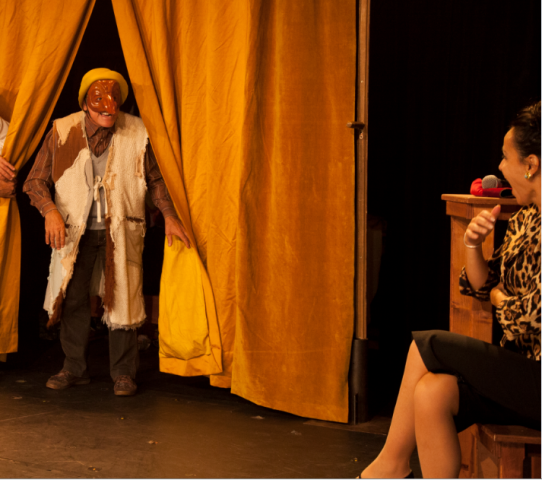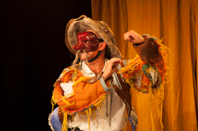 Nous assistons ici à une conférence mise en jeu avec un comédien qui nous régale de sa bonne humeur et de son entrain. Un décor simple, avec côté jardin, une table sur laquelle sont posés des masques ; côté cours, une guitare, des costumes et un masque de sorcière ; en fond de scène, un rideau ocre puis une chaise en son centre.