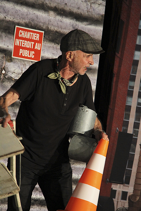 Le metteur en scène a également imaginé des kakémonos géants pour figurer les décors de chaque saynète : un grand chêne vert bien feuillu perdu en rase campagne, un rideau métallique crasseux fermé sur une ruelle malfamée, une barre d’immeuble aux centaines de fenêtres surplombant la ville, et une forêt de roseaux bordant une plaine soumise aux quatre vents. Quelques éléments épars en fond de scène (ici, un plot de travaux et un saut, côté jardin ; là-bas, une grande échelle et un morceau de tôle figurant un puits, côté cour) viennent compléter le décor dépouillé du plateau, un bel écrin de jeu pour les comédiens.