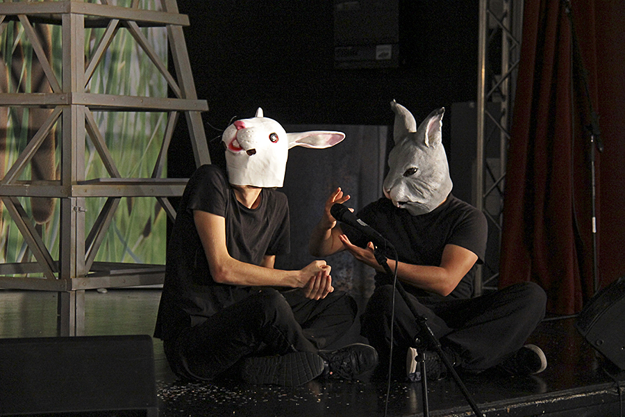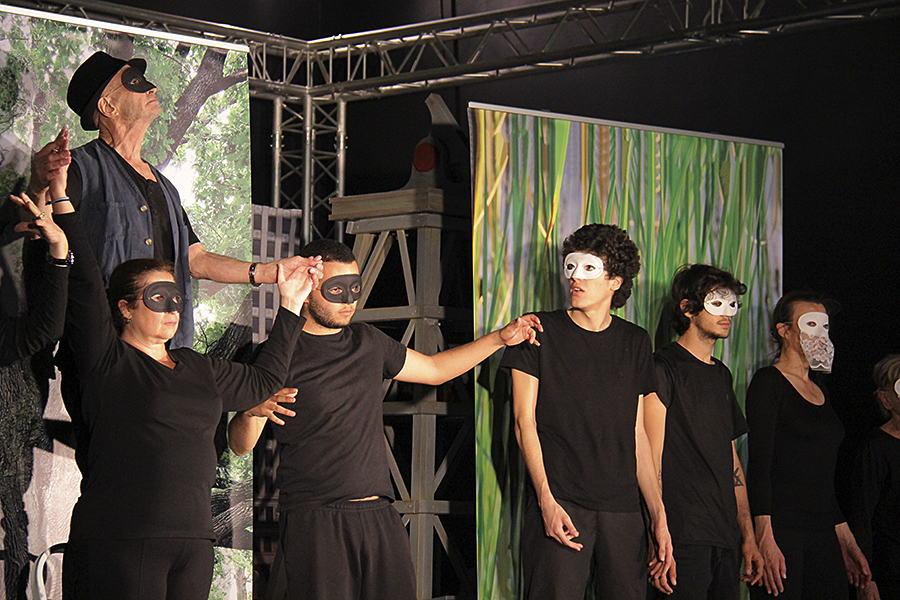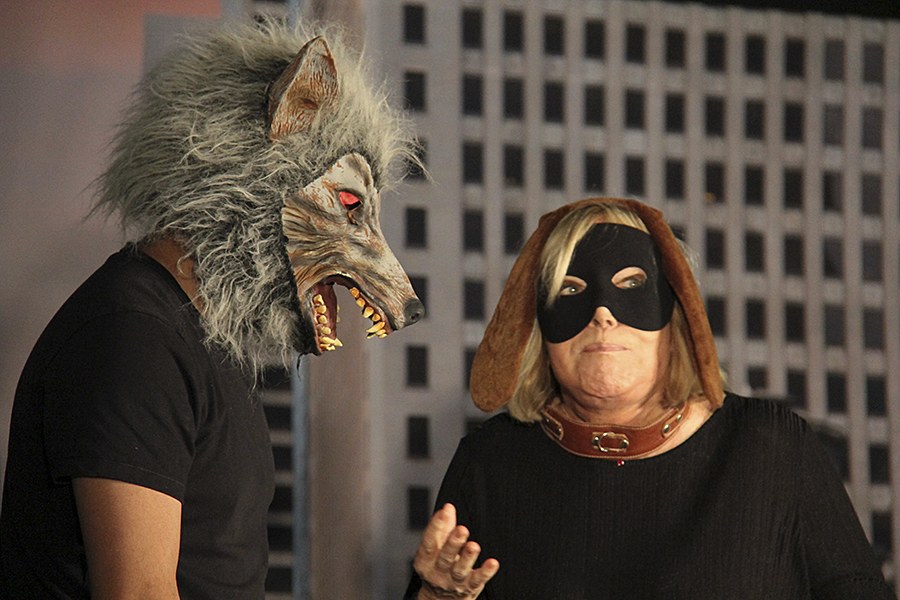 Ces derniers, vêtus de noir, arrivent, en file indienne, à la suite, sur la scène, au son d’une petite musique entêtante et enjouée, leitmotiv musical donnant le La à chaque début de tableau. Un personnage tenant un livre est déjà sur la scène, proposant aux acteurs des masques et autres accessoires. Une mise en scène qui fourmille de bonnes idées (notamment les intermèdes – quand Gérard joue le facteur, voire quand s’invitent deux rappeurs sur scène-, mais la fin, également, avec la mort du chêne, sont bien vues) et une entrée en matière qui nous rappelle que nous sommes au théâtre et que nous allons voir des acteurs se métamorphoser en animaux de tout poil pour nous conter quelque fable animale. Chaque comédien doit ainsi incarner les personnages animaliers des fables de la Fontaine, affublés d’un masque et/ou d’une queue, symbole de l’animal de la fable présentée.