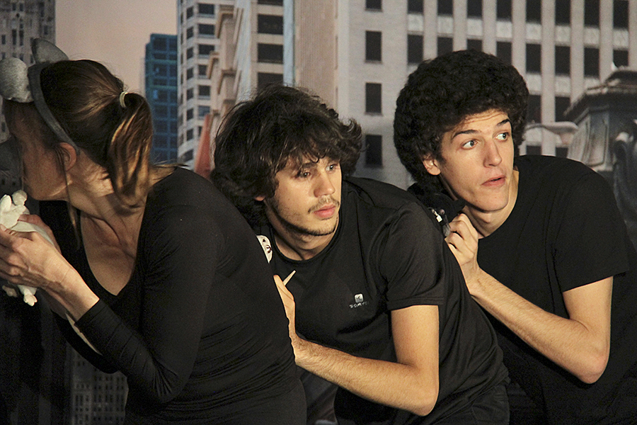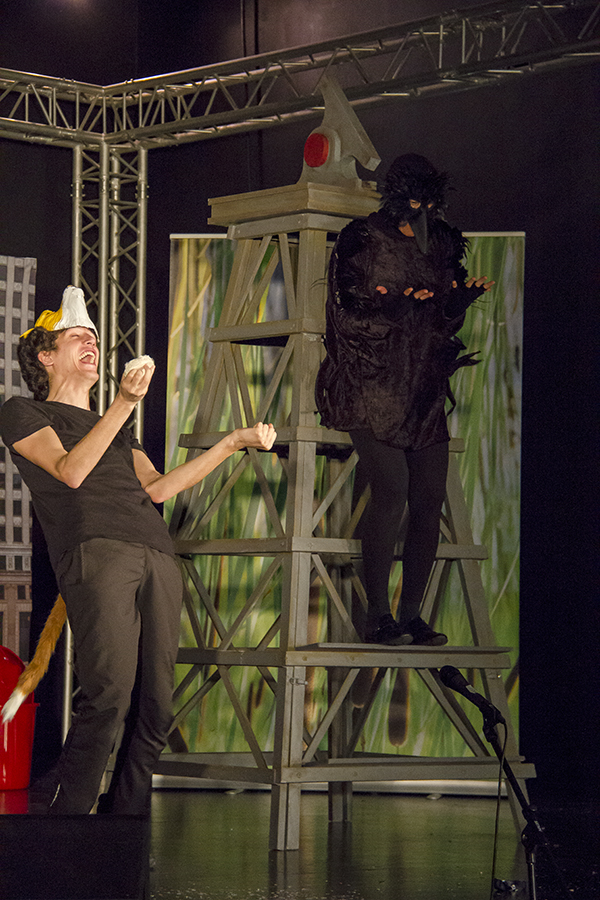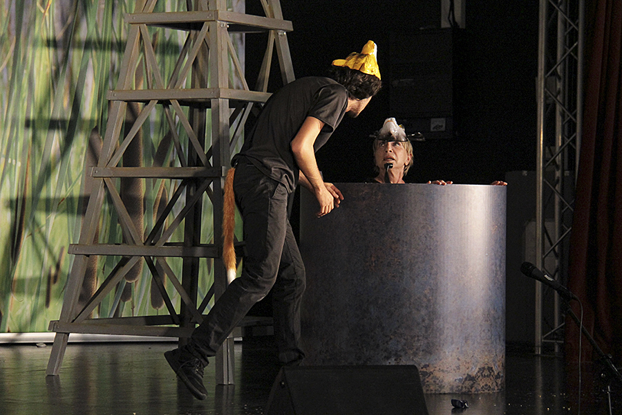Les tableaux se succèdent avec rythme : un petit noir, bref, permet de passer d’une scène à l’autre sans perdre le fil du spectacle, aucun temps mort ne vient interférer dans le déroulé de cette création vive et dynamique, rythmée par une musique entrainante et joyeuse à l’image de la troupe. Car ici, les comédiens font preuve d’un bel effort de diction (chose si rare aujourd’hui au théâtre) et tentent de personnifier les animaux avec conviction et sérieux, même si à certains moments les gestes, parfois pas assez précis et marqués, peuvent paraitre parasités par un relâchement dans le jeu (notamment chez le jeune Zaccharie qui tend à en faire un peu trop ou lors des entrées/sorties des personnages). Néanmoins, l’ensemble est homogène et les correspondances entre le comédien et l’animal incarné sont judicieuses. Un très bon choix dans la répartition des rôles.